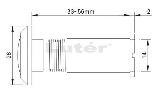 Wide Angle Solid Brass Door Viewer- Glass or plastic lens- Bore size 14mm (9/16"). OD 26mm- Door thickness from 33mm to 56mm (1 3/8" to 2 1/4")- Easy to install through-door- Individually boxed- 500pc/ctn/1.0'/15kg/18kg*Available with UL approved(rated 1-1/2 hr)
