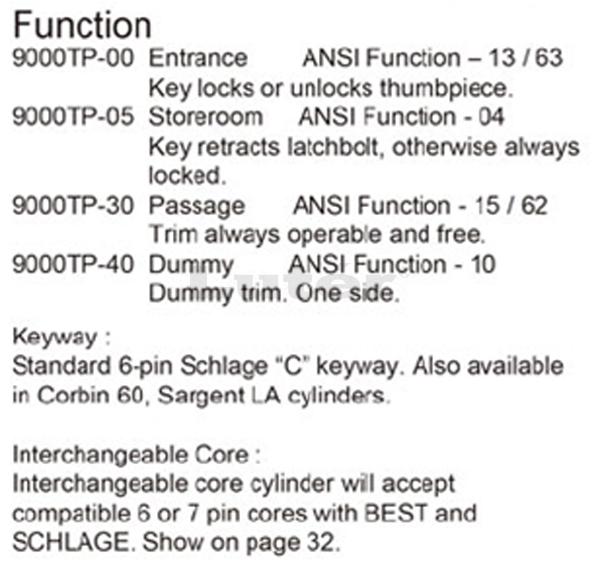 (Entrance ANSI/BHMA Function 13/63, Key locks or unlocks thumbpiece) |