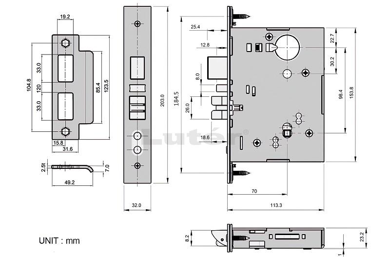 Lock case: | Center to center: 3-7/8”(98mm) or 3-5/8”(92mm); Heavy-gauge (2.3mm) steel, 6-1/16" (154mm) x 4-7/16" (113mm) x 1" (25mm). |