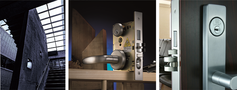 Latch bolt operated by key from outside or by handle from inside. Outside handle is always inoperable. Inside handle is always free for immediate exit. Auxiliary latch deadlocks latch bolt when door is locked.