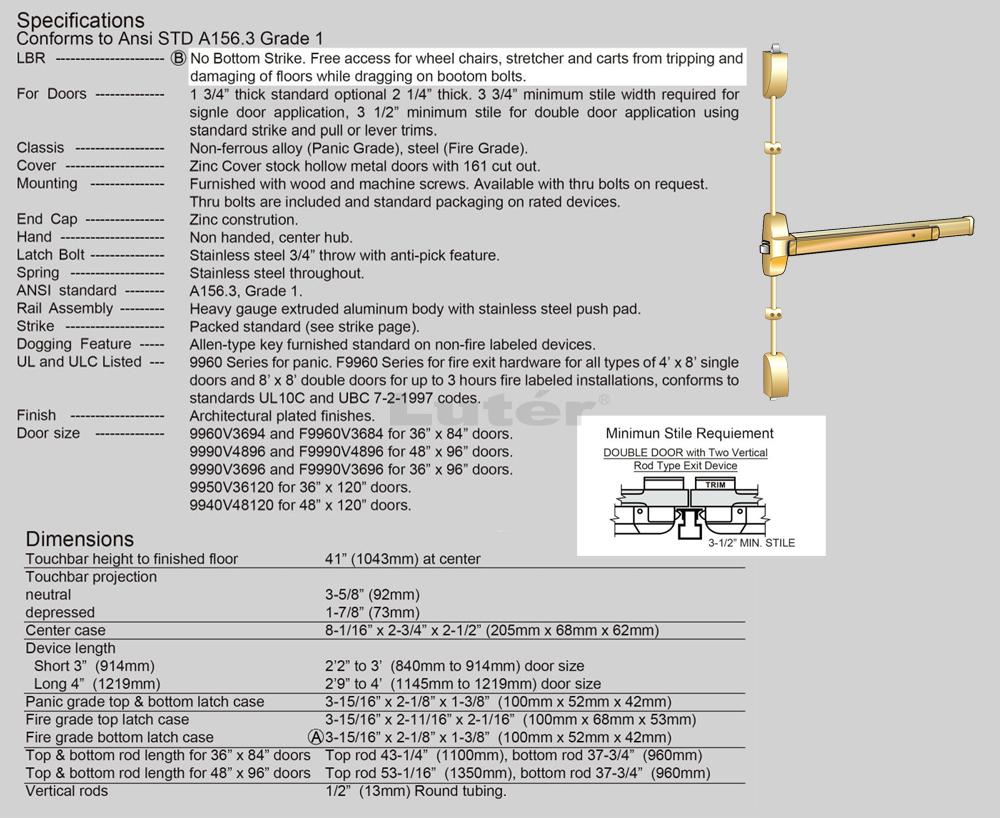 FC1100-4896" | For 48" wide x 96" high doors. | - Powder coated: Aluminum, Bronze, Oxidized Satin Bronze Plated(US10B). - Plated: Polisheed brass or chrome. - Solid stainless steel: Polished or satin. |