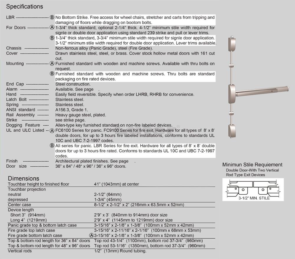 FC6100-4896" | For 48" wide x 96" high doors. | - Powder coated: Aluminum, Bronze, Oxidized Satin Bronze Plated(US10B). - Plated: Polisheed brass or chrome. - Solid stainless steel: Polished or satin. |