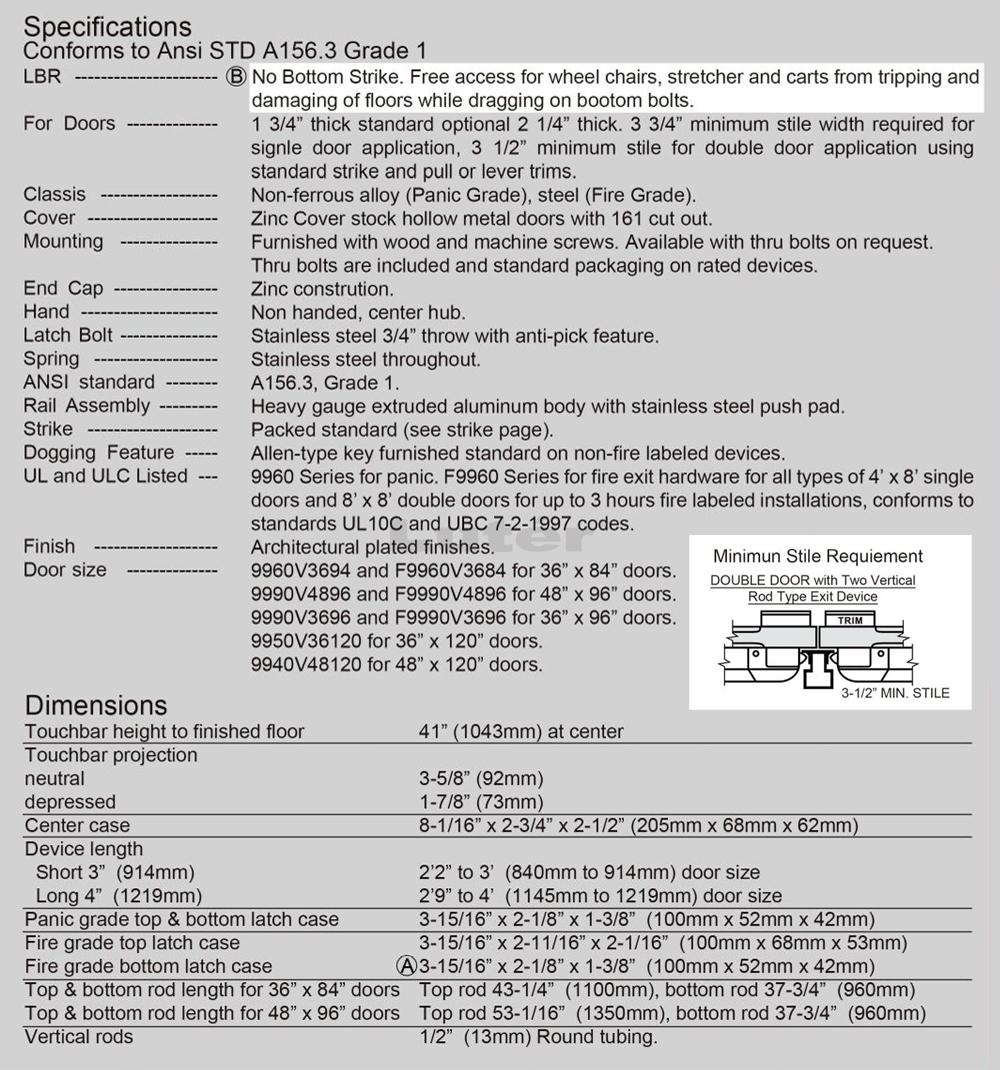 FC4100-4896" | For 48" wide x 96" high doors. | - Powder coated: Aluminum, Bronze, Oxidized Satin Bronze Plated(US10B). - Plated: Polisheed brass or chrome. - Solid stainless steel: Polished or satin. |