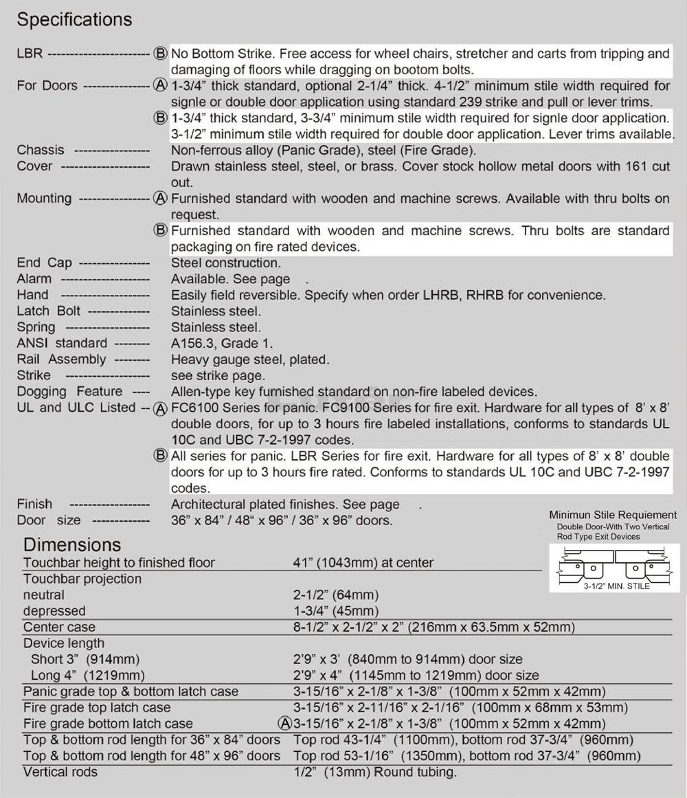 FC9100-4896" | For 48" wide x 96" high doors. | - Powder coated: Aluminum, Bronze, Oxidized Satin Bronze Plated(US10B). - Plated: Polisheed brass or chrome. - Solid stainless steel: Polished or satin. |